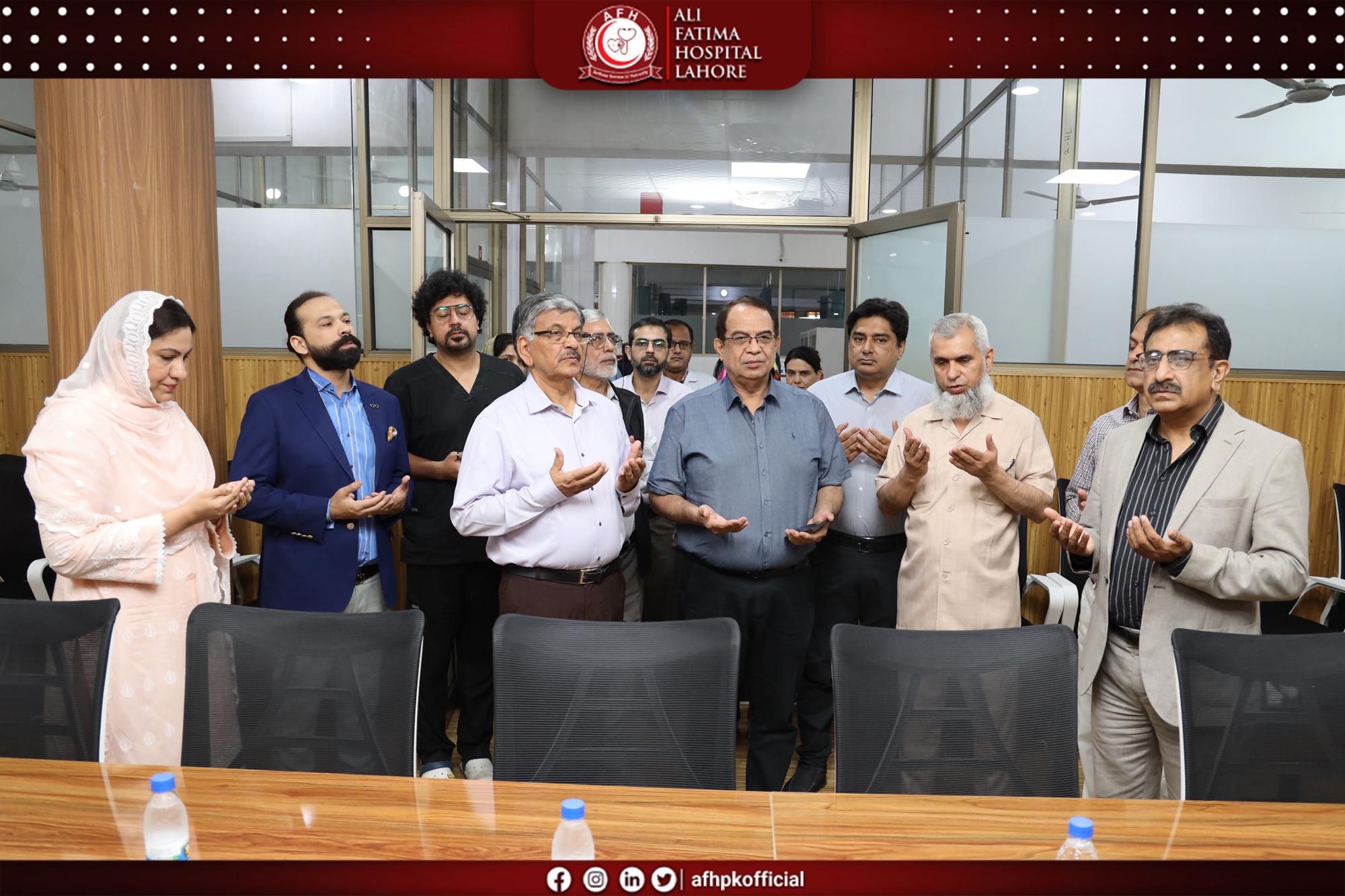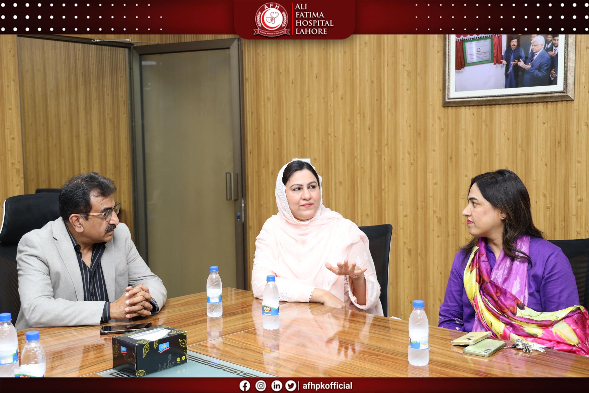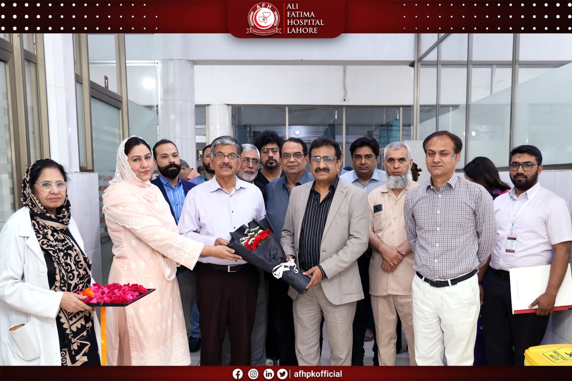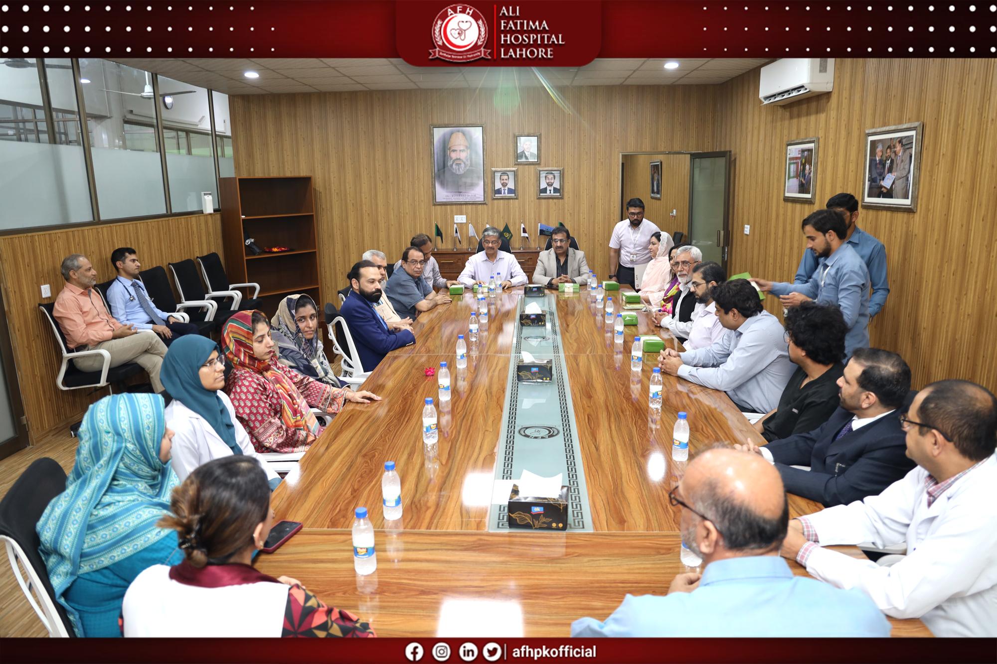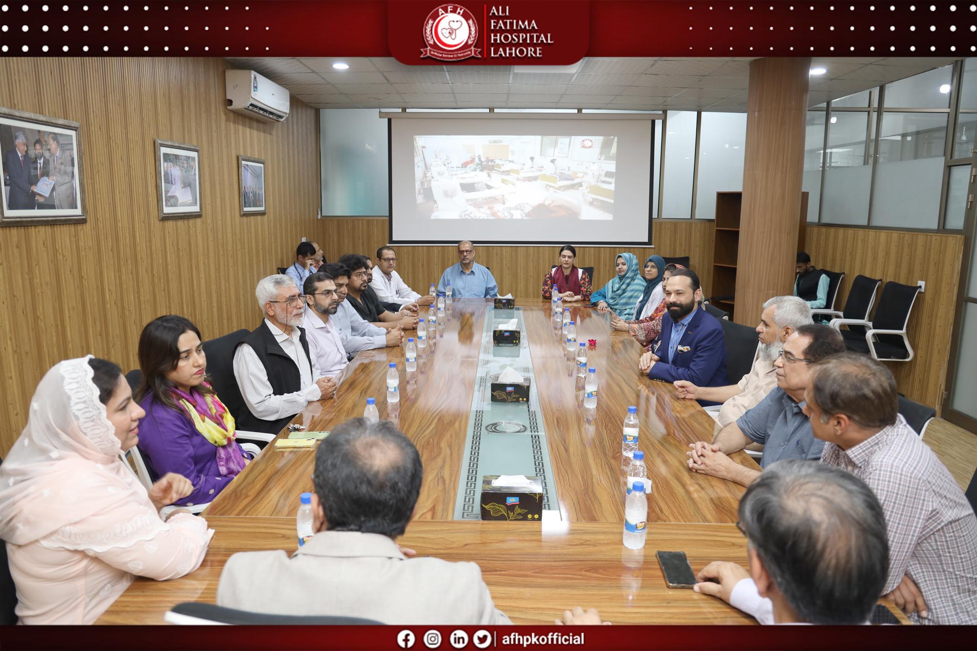 The Conference Room Inauguration Ceremony was successfully held at Ali Fatima Hospital, marking an important milestone in strengthening collaboration and institutional development. The event was graciously led by the Medical Superintendent, Dr. Dimple Mustafa, alongside the hospital administration, who extended a formal invitation to the Rector of Green International University, Prof. Dr. Mubbsher Munawar Khan. This occasion not only celebrated the inauguration of a modern and well-equipped conference facility but also served as a meaningful platform for engagement between the two institutions. A productive and forward-looking meeting took place, focusing on future collaborations, shared goals, and opportunities in the fields of healthcare and education. The gathering highlighted a strong mutual commitment to building impactful partnerships and fostering a progressive environment that supports growth, innovation, and excellence.